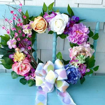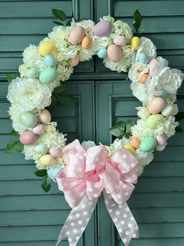 Spring wreath made from Grapevine Base and loaded with white silk flowers, and layered with foam Easter Eggs and Pink Bow.