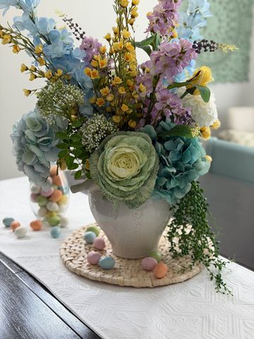 Extra Large Centerpiece is crafted from a variety of spring-colored silk flowers, and resting in a ceramic vase. Perfect for your table!