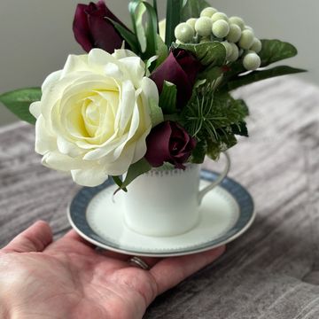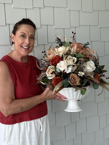 Layers of burnt-orange, tea, beige, cream, and tan roses fill this delectable Portuguese ceramic compote dish. Accented with simulated blueberry stems, multi-colored willow leaves, and others complete this arrangement.