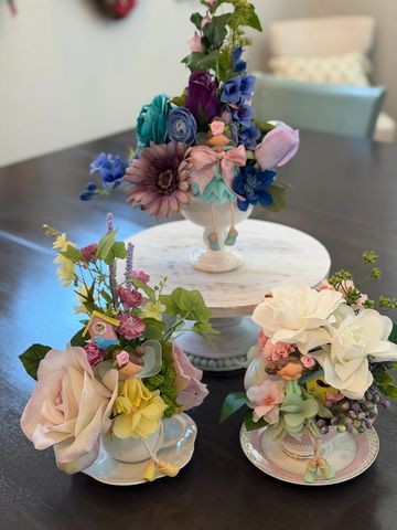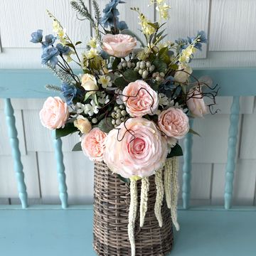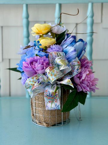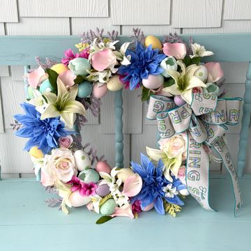 Made with a variety of "Real Touch" tulips, calla lilies, day lilies, roses, and Easter Lilies, and pastel eggs.