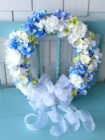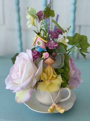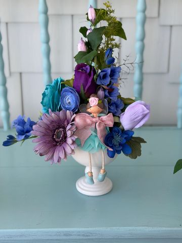 Grapevine base is layered with a variety of garden blossoms, a miniature tree, and loaded with purple hydrangea accents. Sister Fairies, one yellow, and the other, green, sit on both sides of the wreath to adda little whimsy to this creation!