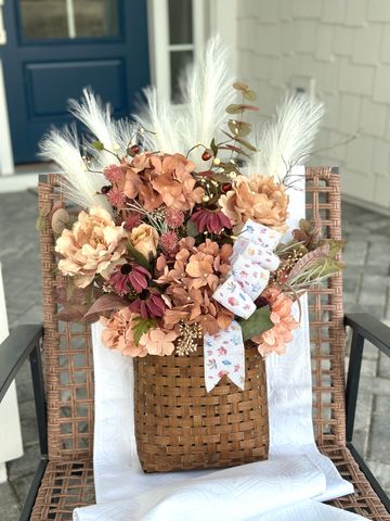 Peonies, Hydrangea, Plum Echinacea, Eucalyptus, Fall leaves, and Cream Fluffy Grasses in a woven, 1/2 basket. Ready for your hanging on your front door!