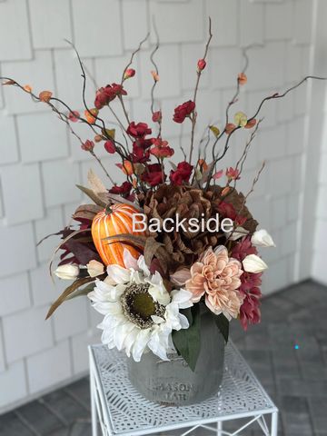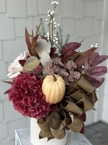 A variety of gray peonies, wine roses, and cream-colored blooms are partially surrounded by fall leaves. Then, simply kissed with grey-marbled pumpkin on the bottom.