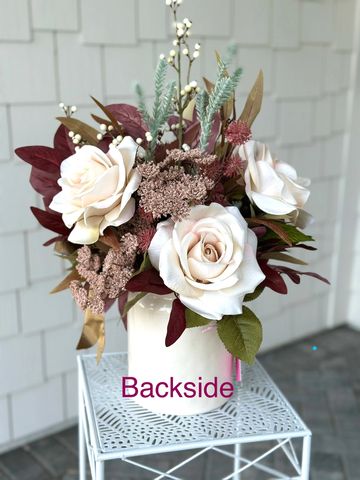 Plum-colored leaves and hydrangea with lavender-ish Queen Anne's Lace gather around a nude-colored pumpkin and olive-green bow. Turn it around to see the gorgeous cream-plum roses in back!