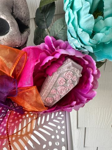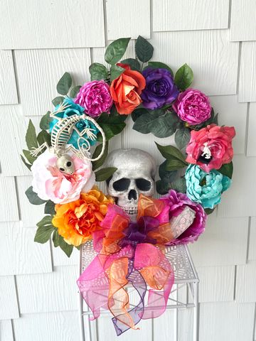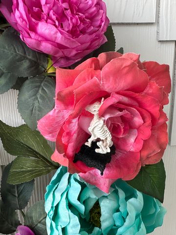 With a nod to Dia de los Mueurtos this wreath boasts brightly colored peonies, a lightweight skull, and skeletons of a gecko, small dog, and a rose-decorated coffin. All in light-hearted fun!!