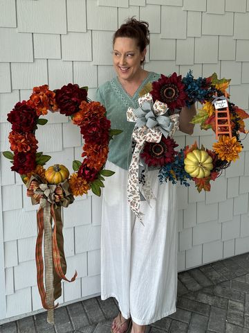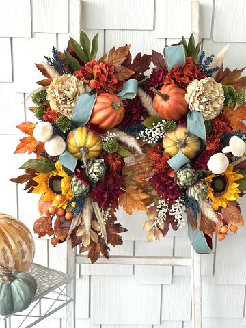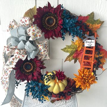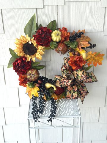 14" Grapevine base is filled with Garnet peonies, a bold sunflower, orange hydrangea, fall leaves, and a variety of gourds. Perfect for smaller doors, or inside the kitchen!