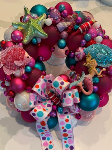 Two-toned Teal and White Bow, layer with funky-colored polka dotted ribbon adorn this white wreath base. Hot pink, fuchsia, blues, and orange glass ornaments throughout.