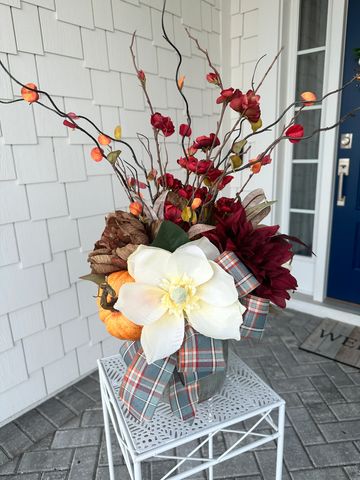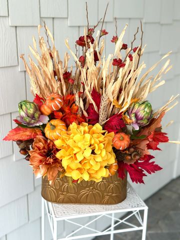 Left: Ruby red peonies, rust-orange hydrangeas, and deep gold mums create a simple, but friendly welcome to any door!