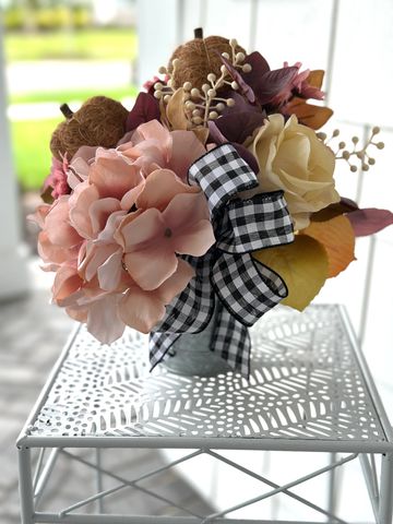 16 oz. pail has wine, pink and cream colored foliage, with natural fiber pumpkins, and wired bow.