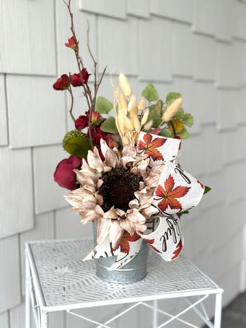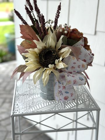 16 oz. pail has white Sunflower, white berries, plum colored accessory foliage.