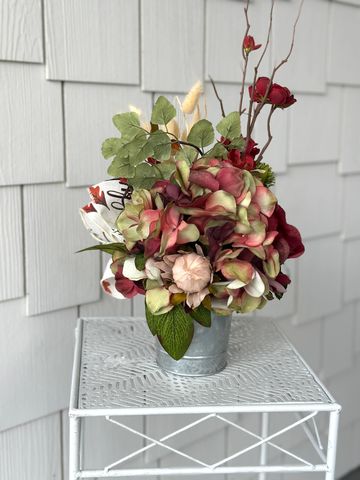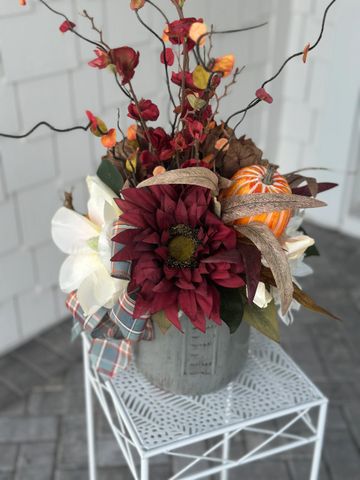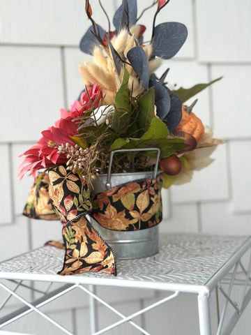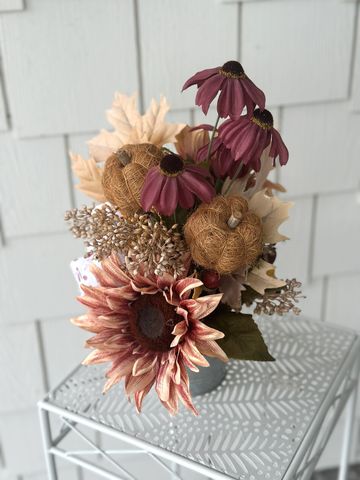 16 oz. pail has wine and cream colored foliage, with natural fiber pumpkins, and wired bow.