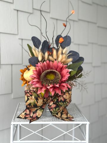 Garnet sunflowers, navy berries, blue eucalyptus sprigs, and assorted leaves form the base. The, added miniature ladder and twin-ribbon bow for a little whimsy!