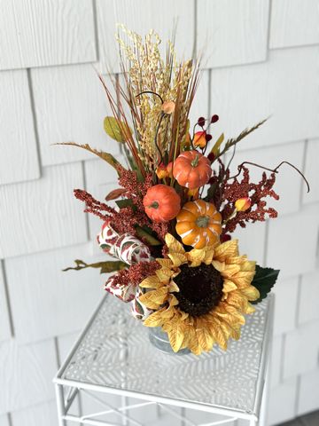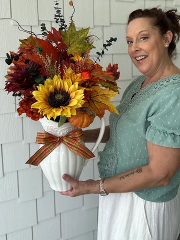 Giant Sunflowers on both sides of this XL Portuguese Ceramic pitcher make it appealing on any table! Assorted fall leaves, Dried Eucalyptus, Wheat-like accessories and more!
