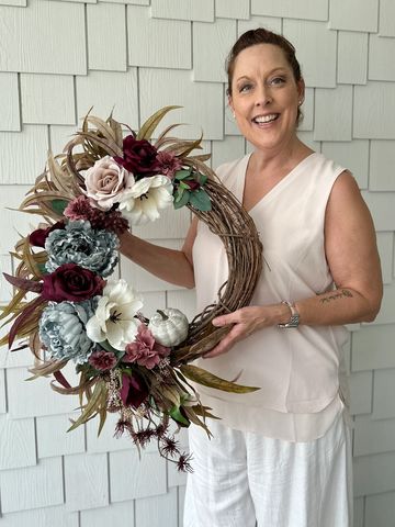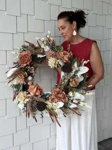 This Beauty has been layered with creams, cinnamon, coffee, beige, and blues to achieve a totally approachable, yet elegant wreath to welcome your guests.