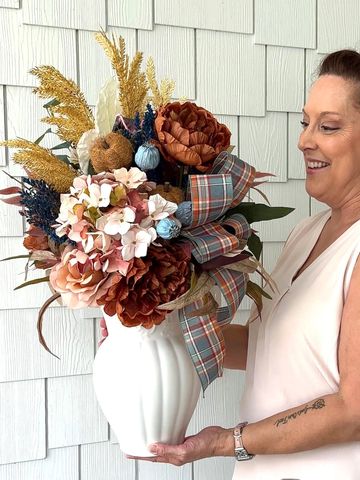XL Portuguese Ceramic Pitcher holds a mixture of cinnamon peonies, blush roses, hydrangea, simulated wheat, baby blue pods, and navy-blue heather. Accessorized with natural fiber pumpkins and Blue-orange-cream-colored bow.